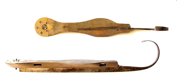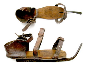 full metal ice skates. The wide slot at the front of the wooden platform hints in the